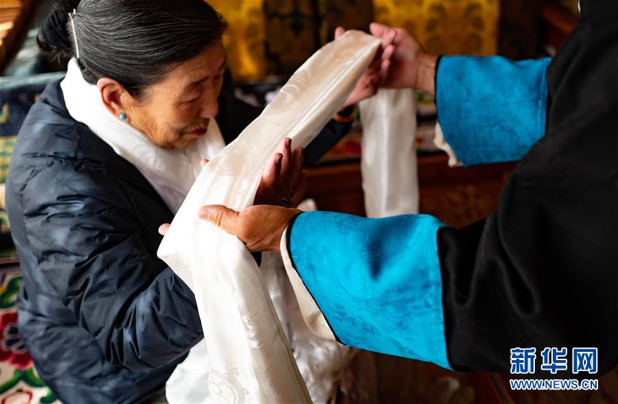 一名藏族群眾給長輩敬獻哈達(dá),祝福長壽(2月24日攝)。新華社記者普布扎西攝