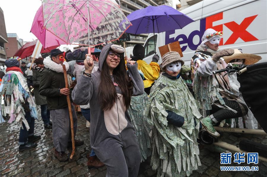 2月27日,人們?cè)诒壤麜r(shí)布魯塞爾參加狂歡節(jié)活動(dòng)。 新華社記者鄭煥松攝