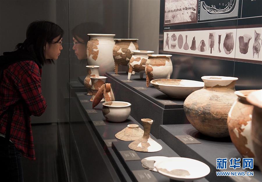 參觀者在二里頭夏都遺址博物館觀看展出的陶器(2019年10月19日攝)。新華社記者李安攝