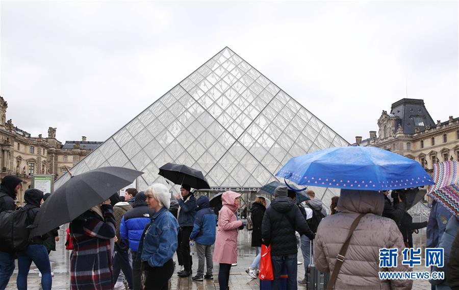 3月2日,在法國(guó)巴黎,游客撐傘走過盧浮宮的玻璃金字塔。新華社記者 高靜 攝
