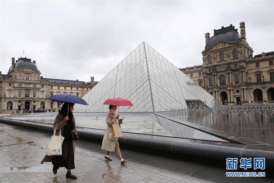 3月2日,在法國(guó)巴黎,游客撐傘走過盧浮宮的玻璃金字塔。新華社記者 高靜 攝