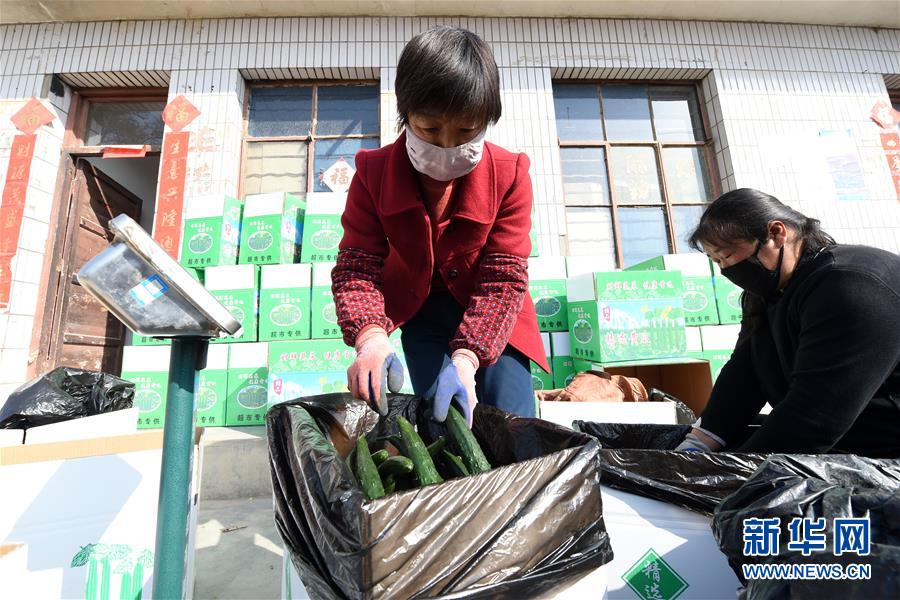 3月4日,在靖遠(yuǎn)縣北灣鎮(zhèn),農(nóng)民將黃瓜稱重裝箱。新華社記者 范培珅 攝