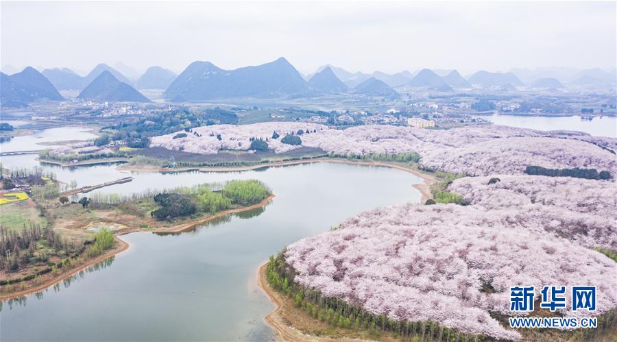 3月12日拍攝的貴安新區(qū)櫻花觀光園風景(無人機照片)。 近日,貴州省貴安新區(qū)櫻花觀光園內櫻花競相盛開,花團錦簇間春意盎然。據介紹,疫情防控期間,為避免人群聚集,櫻花園暫不接待游客。 新華社記者 陶亮 攝