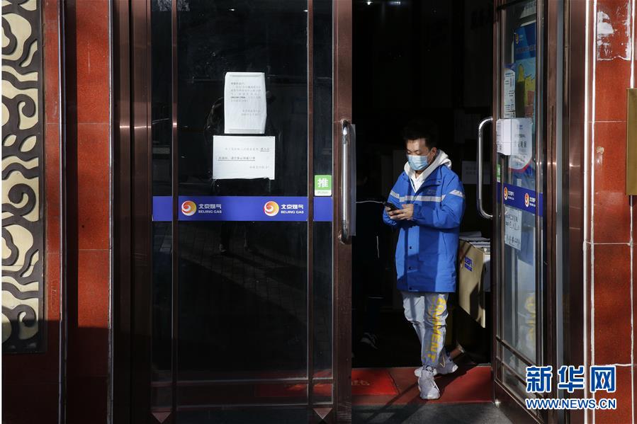 3月12日,李杰(右)在一個投遞點向傳達室工作人員詢問收件人的信息。新華社記者張玉薇攝