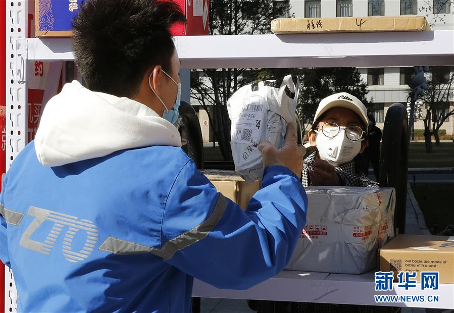 3月12日,李杰(左)在中國(guó)青年政治學(xué)院快遞點(diǎn)隔著柵欄給客戶(hù)遞送包裹。新華社記者張玉薇攝