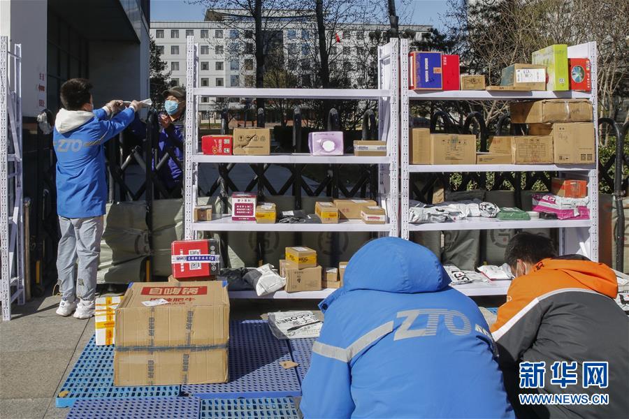 3月12日,李杰(左一)在中國(guó)青年政治學(xué)院快遞點(diǎn)隔著柵欄給客戶遞送包裹。新華社記者張玉薇攝