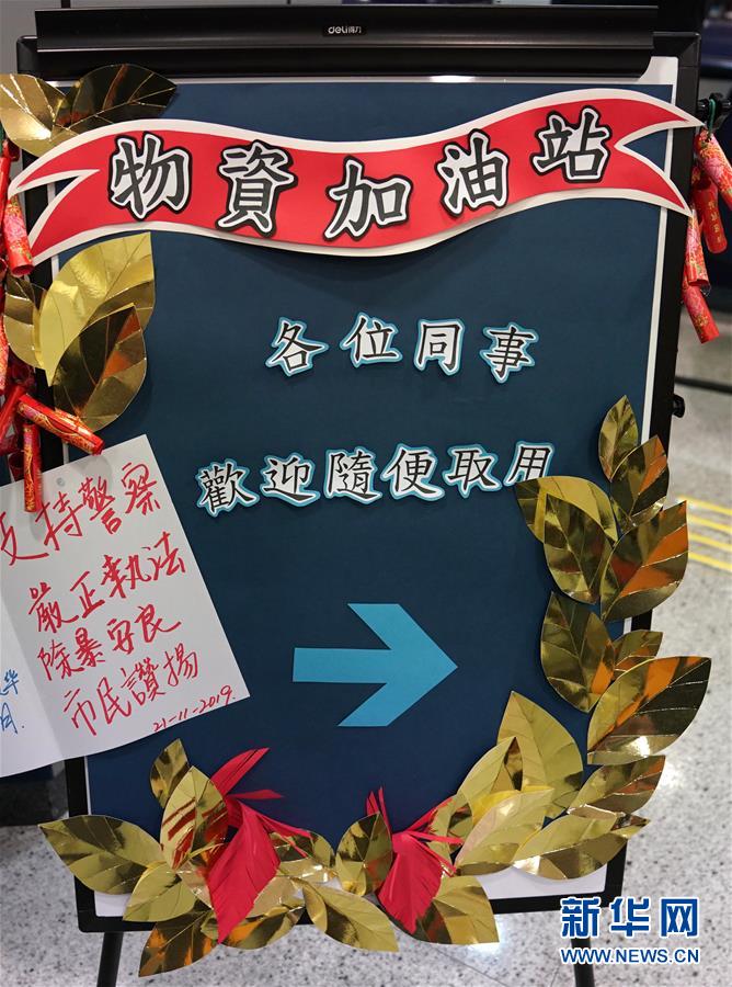 在香港西區(qū)警署一角的物資加油站標(biāo)牌上貼著市民手寫的心意卡(1月27日拍攝)。新華社記者李鋼攝