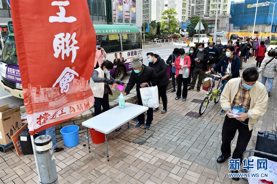 2月23日,市民排隊(duì)領(lǐng)取消毒清潔劑。當(dāng)日,香港工聯(lián)會(huì)在將軍澳向市民免費(fèi)派發(fā)消毒清潔劑。新華社記者盧炳輝攝