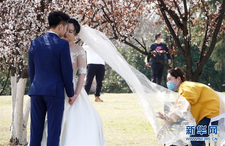 3月15日,在南京東郊體育公園,一名攝影助理給一對拍攝婚紗照的新人整理婚紗。 當日,南京風和日麗,市民們來到東郊體育公園,踏青春游。 新華社記者 楊磊 攝