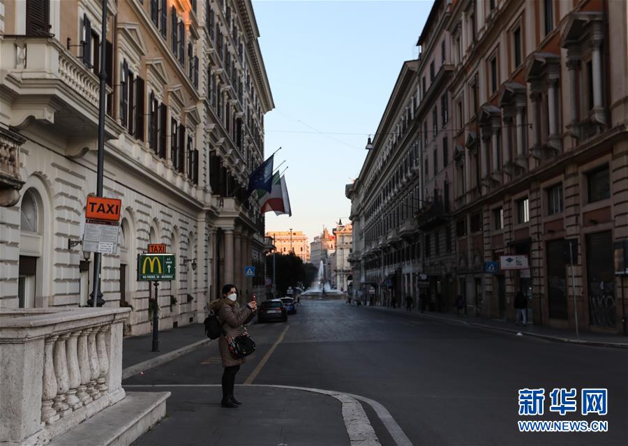 3月16日,在意大利首都羅馬,一名女子戴著口罩出行。新華社記者程婷婷攝
