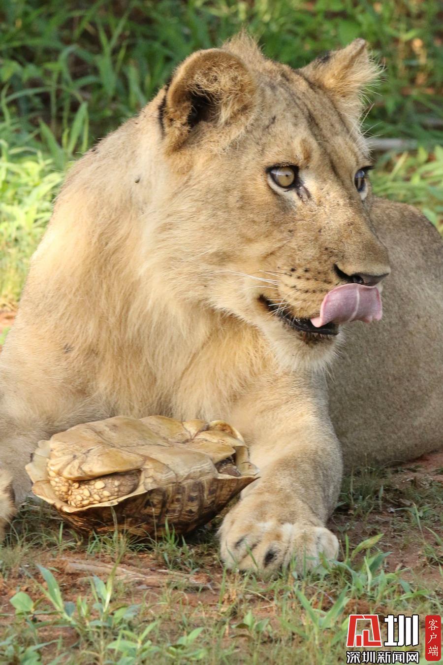 肯尼亞獅子捉了只烏龜當(dāng)“零食” 啃不到肉肉好生氣!