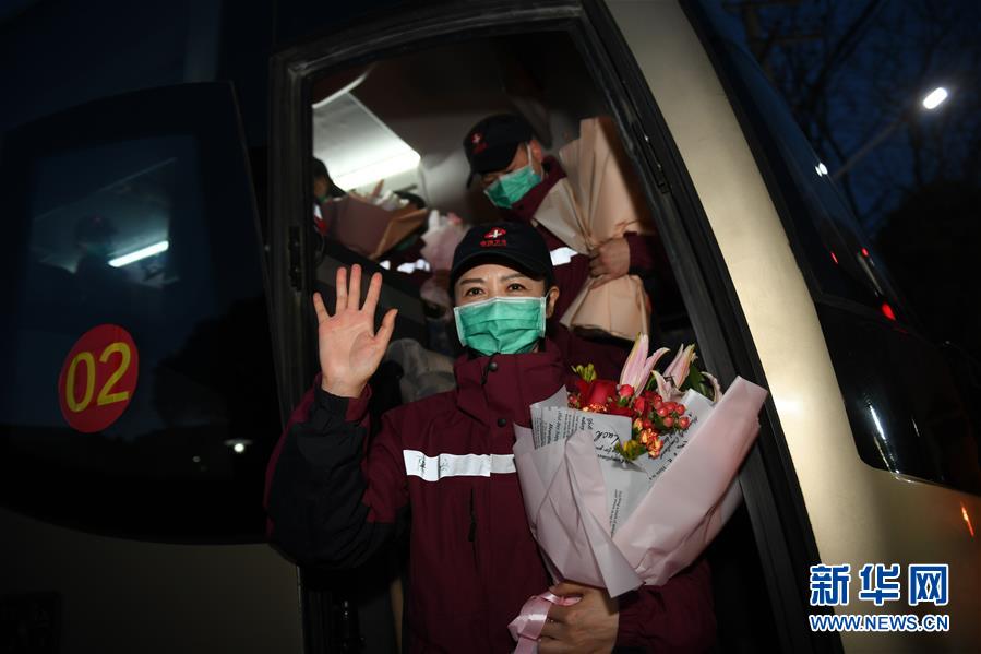 3月17日,抵達(dá)陜西西安的醫(yī)療隊(duì)隊(duì)員向前來(lái)迎接的人員揮手致意。新華社記者李一博攝