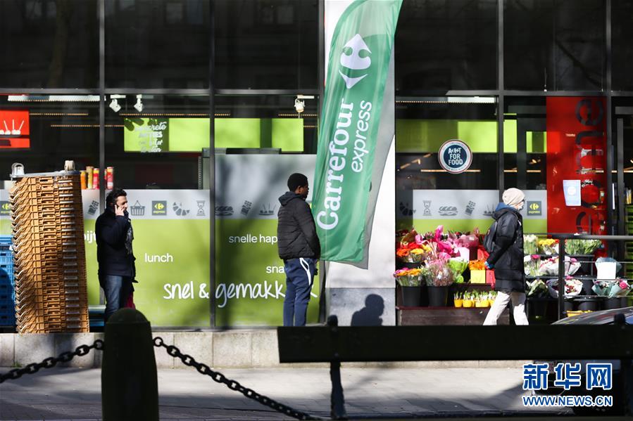 3月18日,顧客在比利時(shí)布魯塞爾的一家商店排隊(duì)購(gòu)物。 新華社記者 潘革平 攝