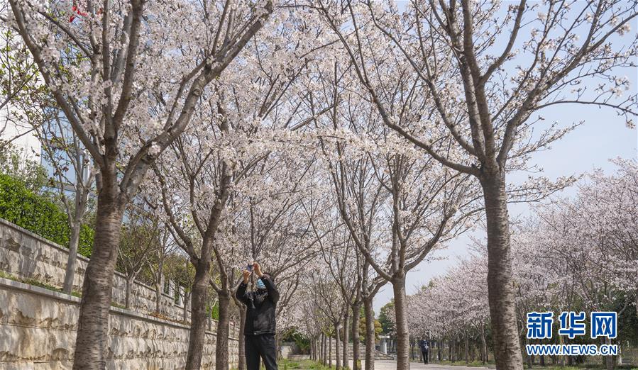3月19日,在武漢市武昌區(qū)被網(wǎng)友稱為“武漢最美停車場”的湖北日報停車場,一名工作人員在拍攝櫻花。 新華社記者 才揚 攝