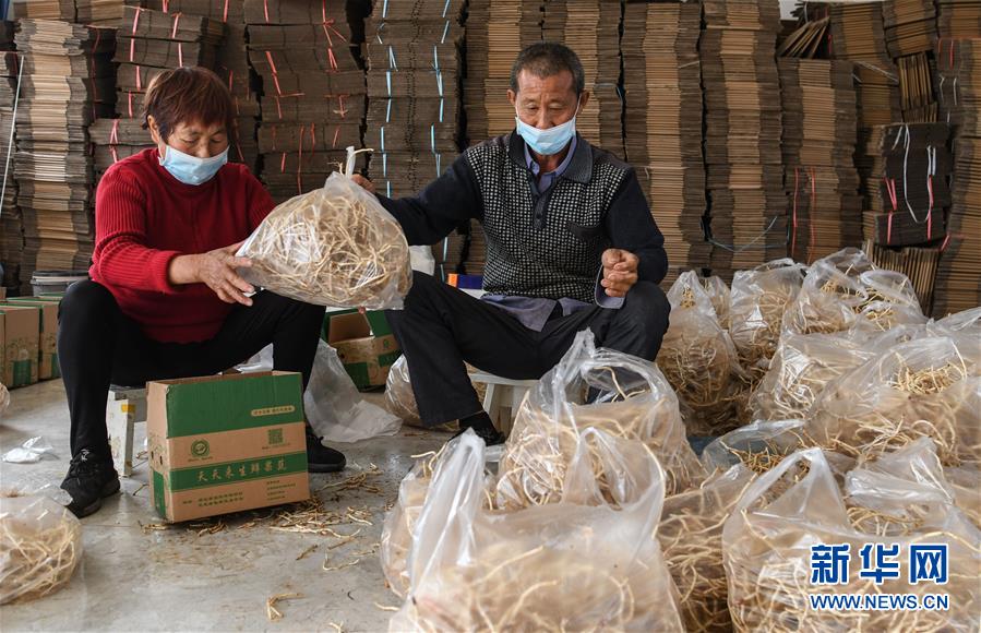 湖北當(dāng)陽(yáng)市壩陵辦事處群華村村民宋發(fā)林(右)和妻子在農(nóng)產(chǎn)品合作社包裝產(chǎn)品,準(zhǔn)備通過(guò)電商外銷(xiāo)(3月21日攝)。近日,湖北當(dāng)陽(yáng)市農(nóng)業(yè)生產(chǎn)和農(nóng)產(chǎn)品加工加速恢復(fù)。截至3月19日,當(dāng)陽(yáng)市86家規(guī)上農(nóng)產(chǎn)品加工企業(yè)復(fù)工復(fù)產(chǎn)率為84.9%,51家農(nóng)業(yè)產(chǎn)業(yè)化重點(diǎn)龍頭企業(yè)有48家復(fù)工復(fù)產(chǎn),占比達(dá)94.1%。新華社記者程敏攝