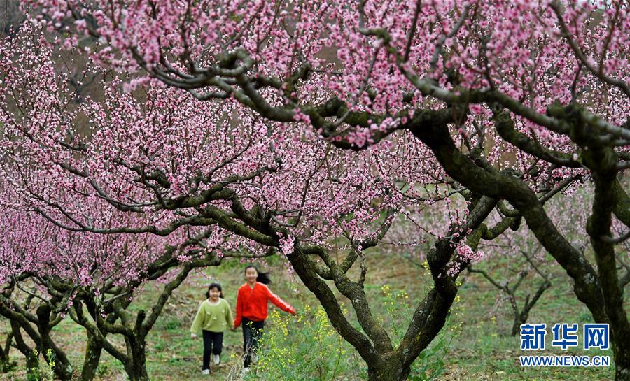 3月22日,兩位小朋友穿行在柳山湖畔盛開的桃花叢中。陽春三月,陜西省漢中市洋縣龍亭鎮(zhèn)柳山村,1300畝桃園的花朵綻放。新華社記者陶明攝