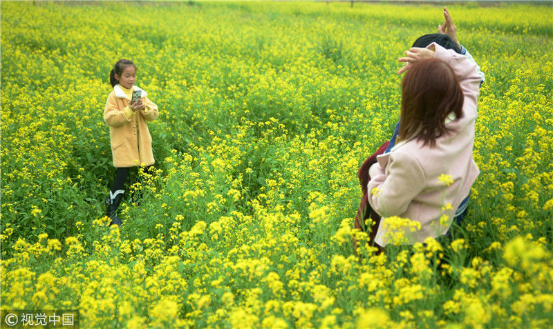 2019年2月5日,廣西來賓,當天是農(nóng)歷大年初一,人們在忻城縣城關(guān)鎮(zhèn)隆光村油菜花海中賞花游玩。