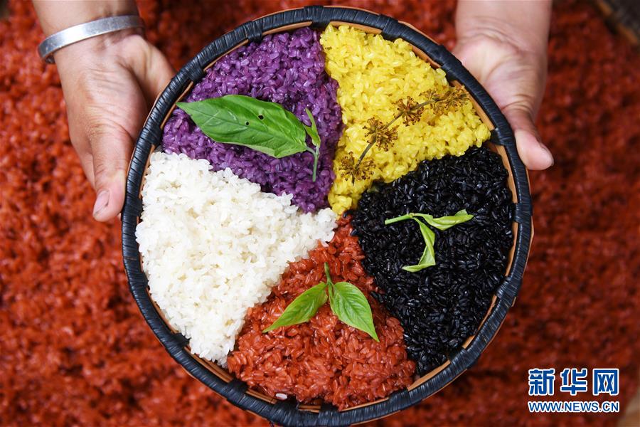 上五圖:4種不同植物及其色素染成的糯米和原色糯米;下左圖:4種不同植物色素染成的糯米和原色糯米;下右圖:在廣西上林縣巷賢鎮(zhèn),兩名壯族村民在查看一桶剛剛蒸熟的五色糯米飯(拼版圖片,3月25日攝)。每年“壯族三月三”到來之際,廣西的壯族同胞都有蒸制五色糯米飯迎接節(jié)日的習(xí)俗,以祈禱五谷豐登,五福臨門。這些五色糯米飯,主要采用天然植物萃取色素,將糯米分別浸泡到紫、黃、紅、黑4種不同植物色素的水里,充分染色后,與原色糯米一起蒸熟而成。色澤鮮艷、清香誘人的五色糯米飯,是“壯族三月三”接待來客時必不可少的傳統(tǒng)美食。新華社記者陸波岸攝