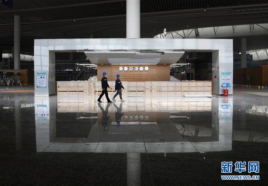 3月25日,兩名工程技術(shù)人員從建設(shè)中的青島膠東國際機(jī)場航站樓出發(fā)大廳走過。新華社記者李紫恒攝