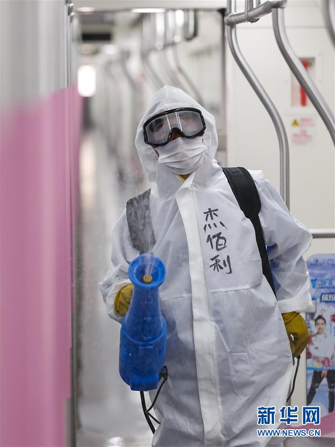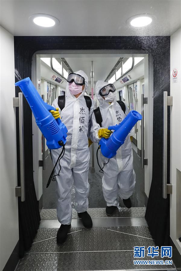 3月23日,在武漢地鐵常青車(chē)輛段,保潔人員在消毒。新華社記者肖藝九攝