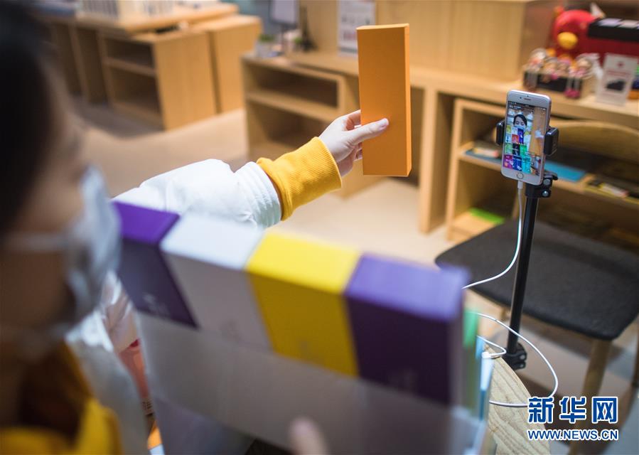 3月29日,在漢口北市場(chǎng),一名主播在直播平臺(tái)直播銷(xiāo)售一款書(shū)包。新華社記者肖藝九攝