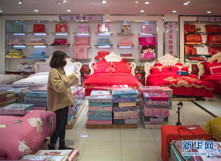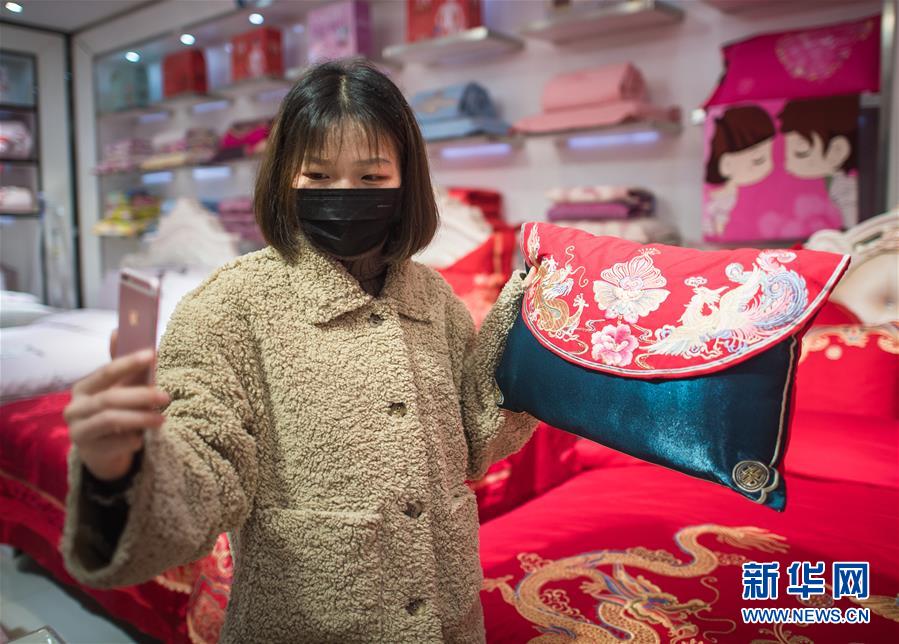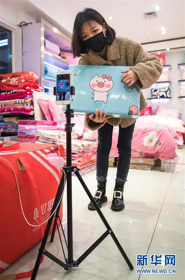3月29日,在漢口北市場(chǎng),一名主播在直播平臺(tái)直播銷(xiāo)售床上用品。新華社記者肖藝九攝