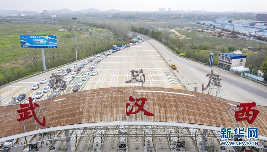 3月24日,在武漢西高速收費(fèi)站交通卡點(diǎn),返漢車(chē)輛排隊(duì)等候入城(無(wú)人機(jī)照片)。當(dāng)日,湖北省新冠肺炎疫情防控指揮部發(fā)布通告說(shuō),湖北省除武漢市以外地區(qū),將于3月25日起解除離鄂通道管控,武漢市將于4月8日起解除離漢離鄂通道管控措施。隨著近日武漢部分企業(yè)逐漸復(fù)產(chǎn)復(fù)工,進(jìn)入武漢的返城務(wù)工人員陸續(xù)增多,車(chē)輛在武漢西高速收費(fèi)站交通卡點(diǎn)有序排隊(duì)返回武漢。工作人員對(duì)返城人員檢查體溫,并核查證明健康的“綠碼”和身份證后放行。新華社記者才揚(yáng)攝