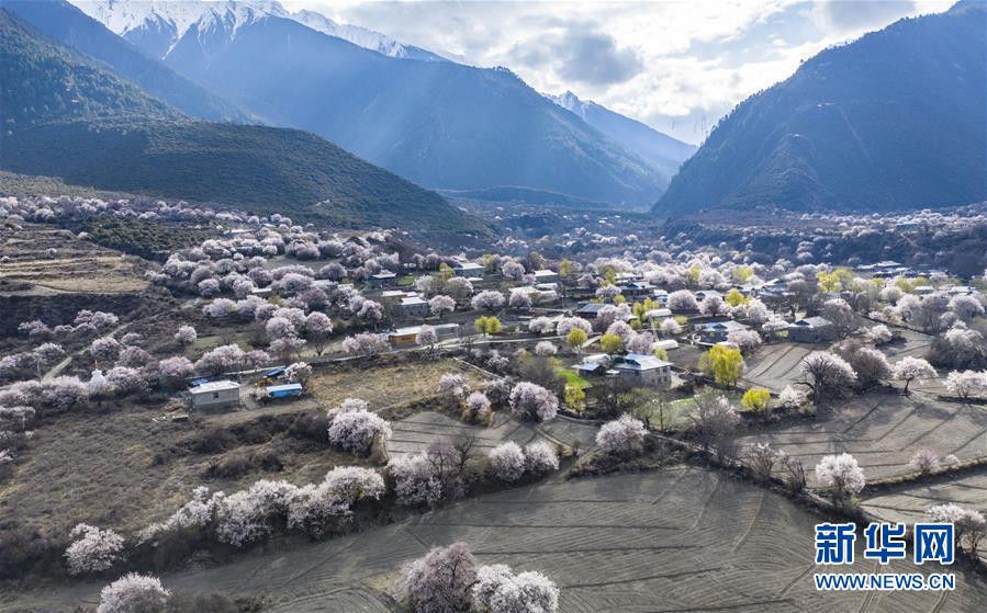 西藏林芝市波密縣境內(nèi)桃花盛開(kāi)的田園風(fēng)光(無(wú)人機(jī)照片,3月26日攝)。新華社記者 晉美多吉 攝