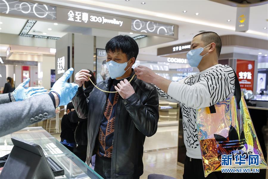 3月30日,在武漢市武商世貿(mào)廣場(chǎng),一名顧客(左)在挑選手鐲。當(dāng)日,武漢市多家商場(chǎng)開門迎客。新華社記者沈伯韓攝