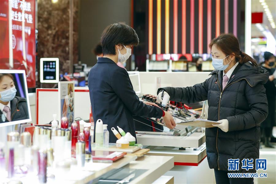 3月30日,在武漢市武商廣場(chǎng),一名管理人員(右)在測(cè)量銷售人員的體溫。據(jù)了解,商場(chǎng)每?jī)尚r(shí)就會(huì)測(cè)量一次所有銷售人員的體溫。當(dāng)日,武漢市多家商場(chǎng)開門迎客。新華社記者沈伯韓攝