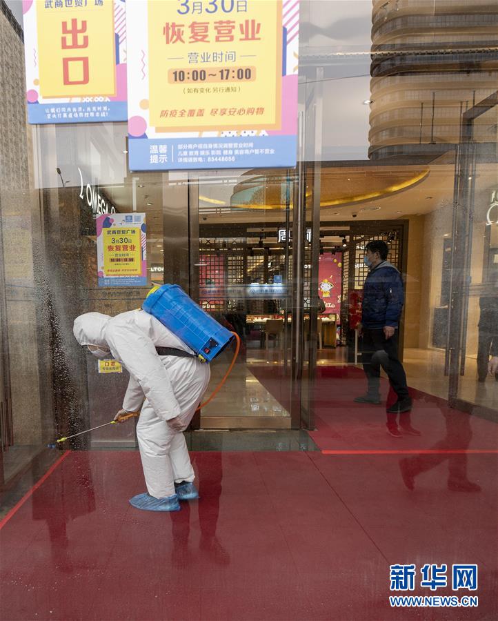 3月30日,在武商世貿(mào)廣場,工作人員在開門前進(jìn)行最后的消殺工作。當(dāng)日,武漢市多家商場開門迎客。新華社記者費(fèi)茂華攝