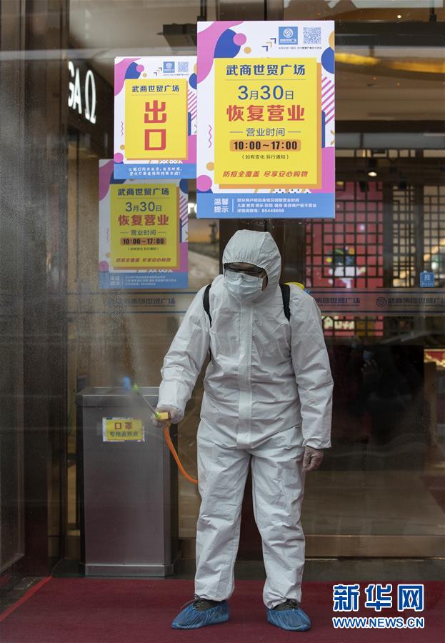 3月30日,在武商世貿廣場,工作人員在開門前進行最后的消殺工作。當日,武漢市多家商場開門迎客。新華社記者費茂華攝