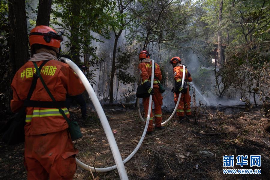 4月1日,四川省森林消防總隊(duì)隊(duì)員用水撲滅余火和煙點(diǎn)。新華社記者江宏景攝