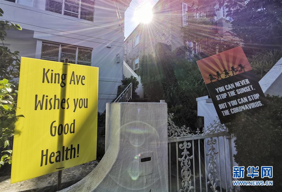 這是4月4日在澳大利亞悉尼費(fèi)爾萊特社區(qū)拍攝的鼓勵(lì)人們樂(lè)觀抗疫的標(biāo)語(yǔ)牌。新華社記者白雪飛攝