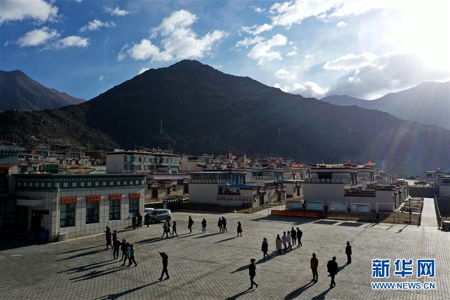 居民走在拉薩市堆龍德慶區(qū)古榮鄉(xiāng)榮瑪高海拔生態(tài)搬遷點(diǎn)廣場(chǎng)上(4月2日攝,無人機(jī)照片)。新華社記者 詹彥 攝