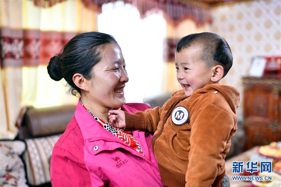 在拉薩市堆龍德慶區(qū)古榮鄉(xiāng)榮瑪高海拔生態(tài)搬遷點(diǎn),白瑪洛宗抱著孩子在客廳里(4月1日攝)。2018年,白瑪洛宗一家7口人告別了尼瑪縣榮瑪鄉(xiāng)藏曲村75平米的舊房子,搬到了榮瑪高海拔生態(tài)搬遷點(diǎn)150平米的新居。新華社記者 詹彥 攝