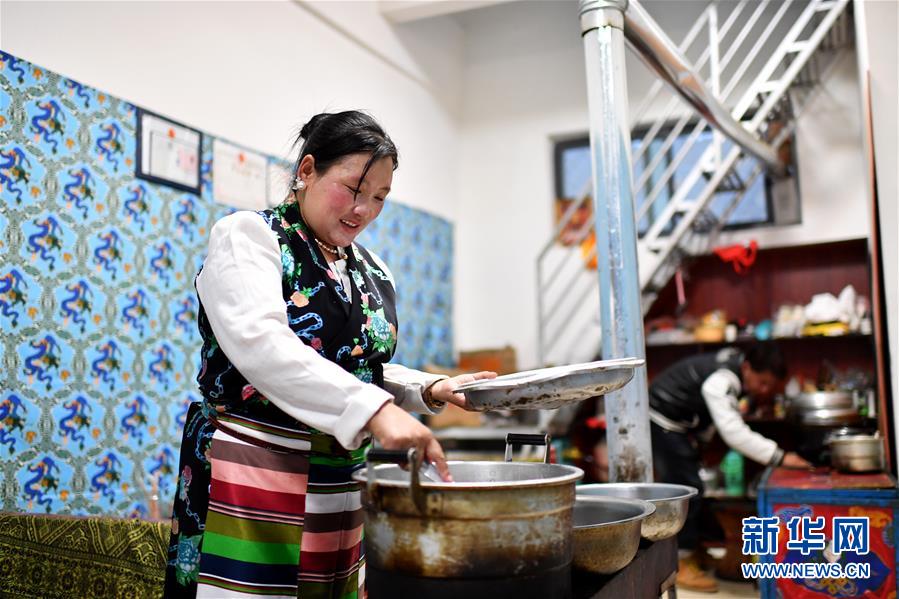 在拉薩市堆龍德慶區(qū)古榮鄉(xiāng)榮瑪高海拔生態(tài)搬遷點(diǎn),歐措(左)和兒子索朗普布在自家開的藏餐館里忙碌(4月1日攝)。新華社記者 詹彥 攝