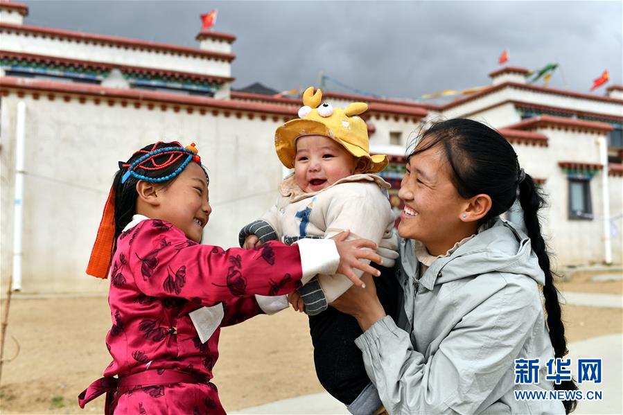 在拉薩市堆龍德慶區(qū)古榮鄉(xiāng)榮瑪高海拔生態(tài)搬遷點(diǎn),石珍(右)和女兒格桑曲達(dá)(左)、兒子嘎瑪曲英在家門(mén)口玩耍(4月1日攝)。石珍是榮瑪高海拔生態(tài)搬遷點(diǎn)醫(yī)務(wù)室的村醫(yī),這份工作每月為她帶來(lái)2590元收入。新華社記者 詹彥 攝