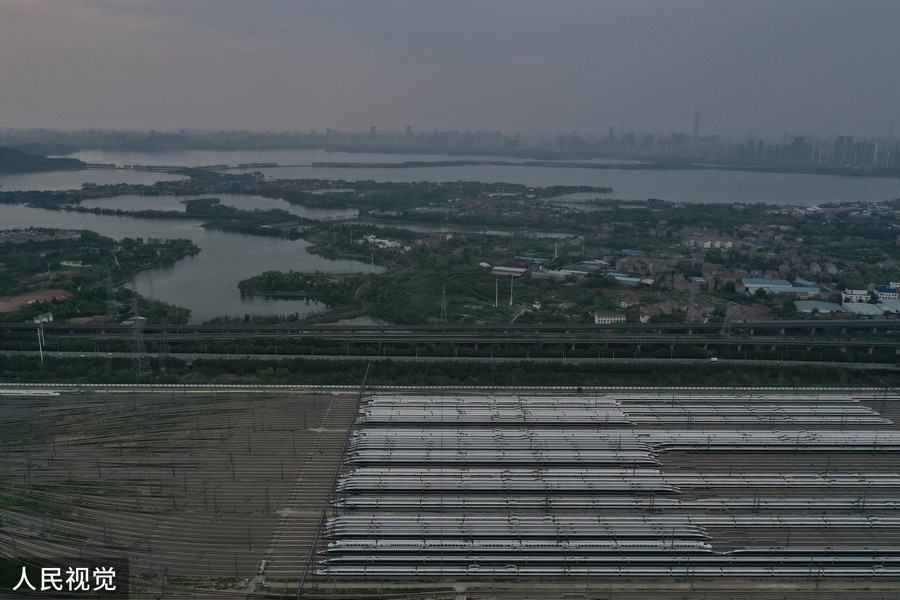 2020年4月6日,武漢動車段高鐵動車組整裝待發(fā)(無人機照片)。