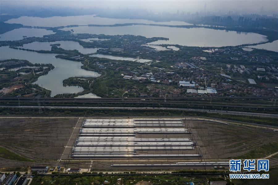 4月7日,在武漢動(dòng)車段,列車??吭诖孳嚲€上(無(wú)人機(jī)照片)。