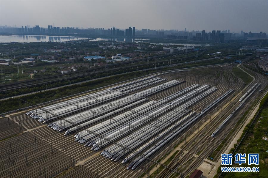 4月7日,在武漢動(dòng)車段,列車停靠在存車線上(無人機(jī)照片)。新華社記者 沈伯韓 攝