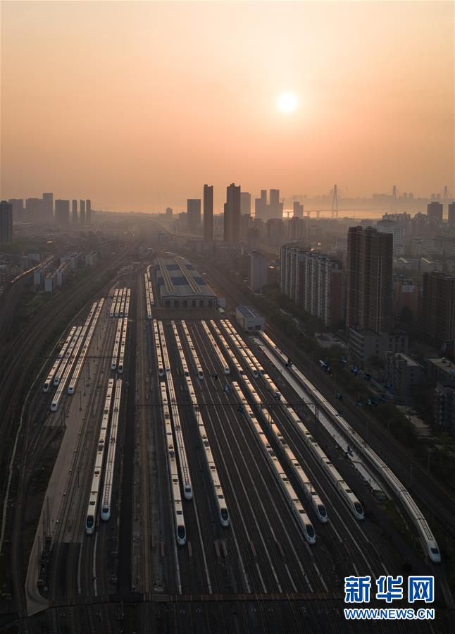 4月8日,在武漢動車段,列車??吭诖孳嚲€上準(zhǔn)備投入運(yùn)行(無人機(jī)照片)。當(dāng)日,武漢市正式解除離漢離鄂通道管控措施,幾十組在武漢動車段經(jīng)過檢修消殺的動車組,猶如“陸地艦隊”??吭诖孳嚲€上,蓄勢待發(fā),重新啟程。 新華社記者 肖藝九 攝
