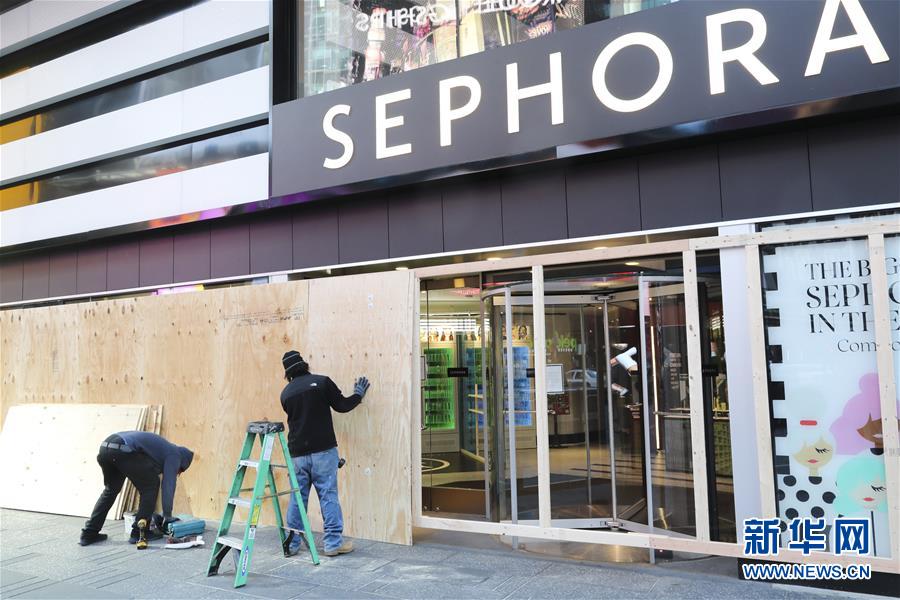3月21日,在美國紐約時(shí)報(bào)廣場(chǎng),工人用木板封閉一家化妝品店。新華社記者王迎攝