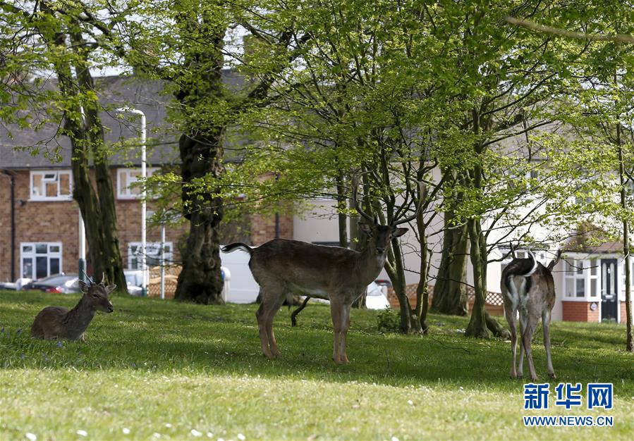 4月8日,在英國倫敦東部一個居民區(qū),附近公園里的鹿在草坪上吃草。隨著新冠疫情在英國的擴(kuò)散,政府要求人們減少不必要的外出。倫敦東部一個居民區(qū)附近公園里原來散養(yǎng)的鹿紛紛從公園走出來,或吃草或接受附近居民的喂食,成為特殊時期居民區(qū)里的新“客人”。新華社記者韓巖攝