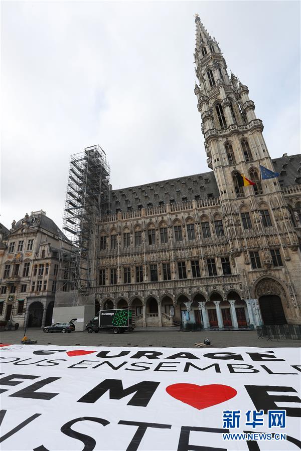 這是4月13日在比利時布魯塞爾大廣場拍攝的為抗擊疫情加油的巨幅海報。當日,比利時布魯塞爾市政府工作人員在市中心的大廣場展開一面巨幅海報,上面用法語和荷蘭語印著“一起鼓起勇氣”“謝謝”,以感謝市民及醫(yī)療人員為抗擊疫情所做的努力。新華社記者鄭煥松攝