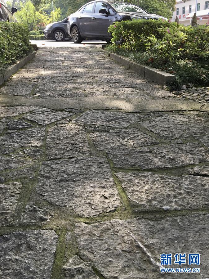 這是4月9日在張家界市區(qū)一路面拍攝的遠古海洋生物化石地板。新華社記者蘇曉洲攝
