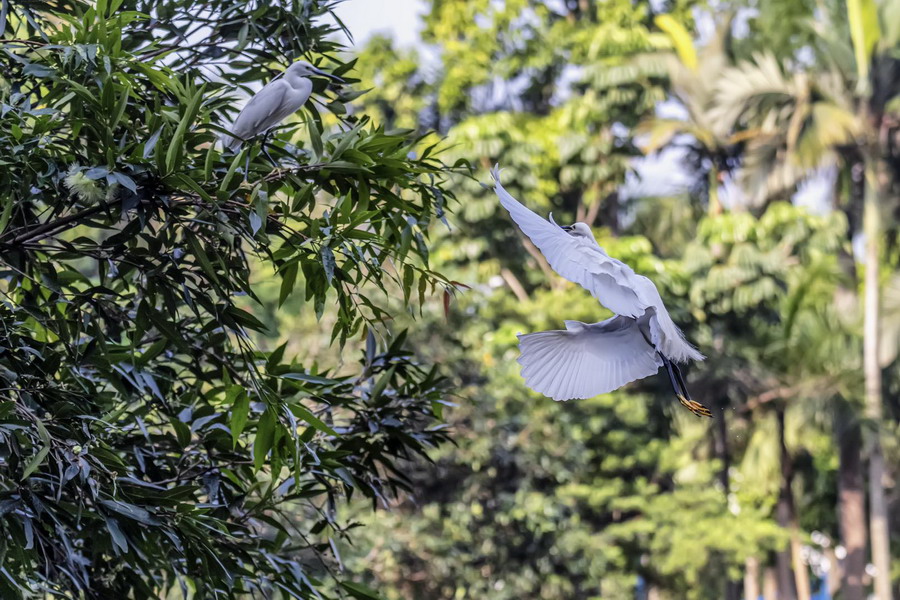 4月15日,攝于南山區(qū)華僑城天鵝堡附近。這是深圳拍鷺鳥的其中一個好去處。左一白鷺捕到食物,后方兩只白鷺追趕。徐捷攝