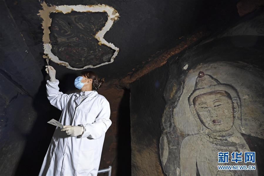 4月27日,文物修復(fù)專家在寧夏須彌山石窟圓光寺48號(hào)窟內(nèi)開展修復(fù)工作。新華社記者馮開華攝