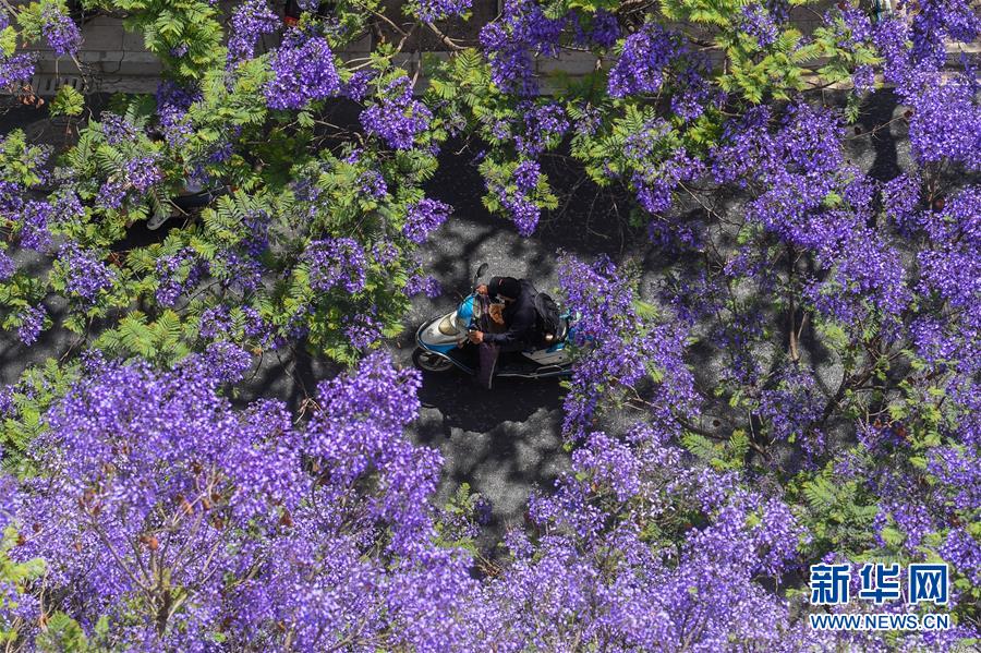 這是5月2日在昆明市教場中路拍攝的藍花楹。近日,云南省昆明市部分街區(qū)的藍花楹競相開放,為春城增添靚麗風景。新華社記者藺以光攝