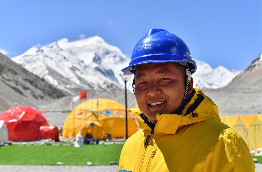 西藏圣山公司高山向?qū)赚旑D珠在珠峰大本營(5月8日攝)。5月8日是世界微笑日。在海拔5200米的珠峰大本營,參與2020珠峰高程測量的各方人員,微笑期待本次測量活動(dòng)的圓滿成功。